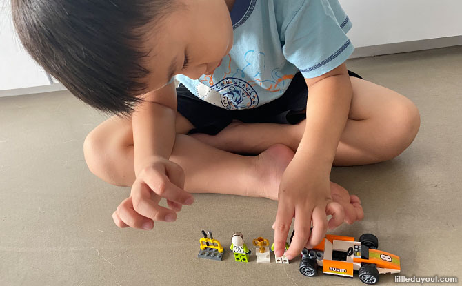 Having completed the build, my son was happily racing the LEGO City 60322 Race Car with his other cars when he suddenly stopped and held out the F1 driver to me. Moving the driver’s helmet visor up and down, he asked me curiously, ‘Mama, what’s this?’ This gave me an opportunity to explain what it was, and from there, we had a good conversation about the F1 event, cars, drivers, uniforms, and even car mechanics and their tools. I can imagine this will be a popular toy during F1 season in Singapore!