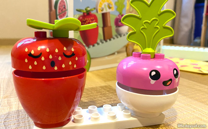40 pieces of DUPLO bricks greeted us when my 3-year-old son and I unboxed the Organic Market 10983 set. The box contained delightfully adorable food pieces including a radish, watermelon, lemon and strawberry.
