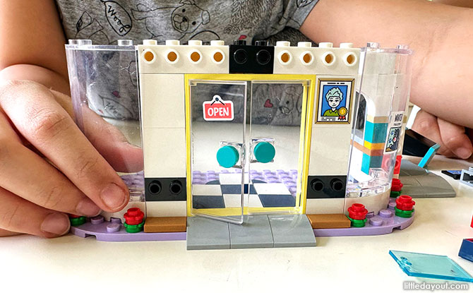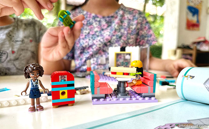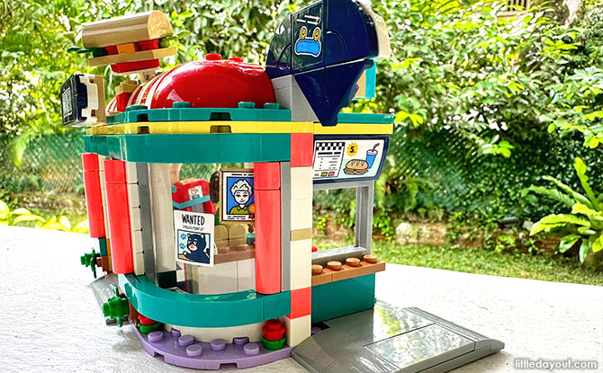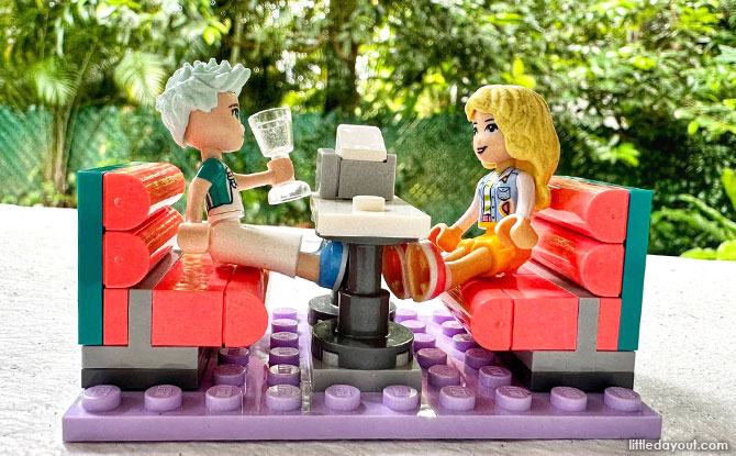 The outdoor seating booth can seat up to four LEGO Friends characters comfortably, and with the accessories provided such as drinks, money, napkin holder, children can pretend to have a party at the diner.