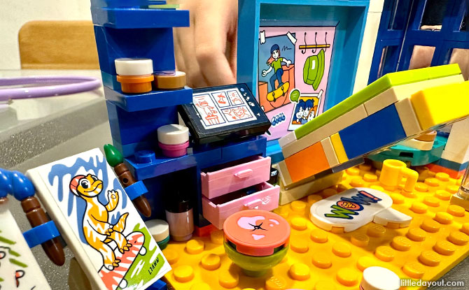 At the side of her room, there is a work area for Liann to store her art materials. The set comes with art-themed accessories such as paint tubes, palettes and easels to inspire creativity. The drawers are a cute feature where the paint brushes fit perfectly inside them. A tablet is propped up to display Liann’s latest comic drawing.