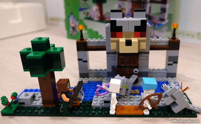 It has 312 pieces altogether so a small but feature-filled set and it is recommended for ages 8+. Wolves are a huge part of Minecraft and taming them is one of the most fun things that Minecraft players love to do. This is an exciting Lego Minecraft set where we build a castle playset (a mob house in the context of Minecraft), minifigures consisting of the Wolf Tamer, 2 Wolves (one tamed version and one untamed) and 2 Skeletons to fight off!