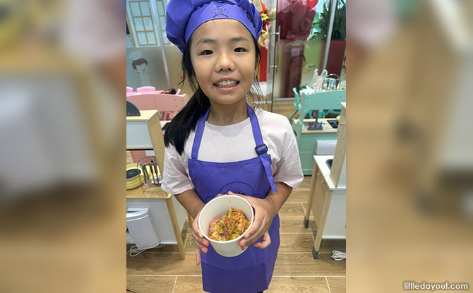 The cooking session at Little Cook lasted about 40 minutes. With guidance from the staff, I could prepare the food alongside with my kids as they prepared the ingredients and then cook and assemble it in their cosy little kitchen space.