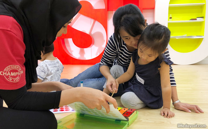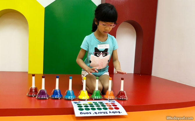 No one could have missed the music activity station. Ding-ding-ding’s of the familiar Baby Shark tune played on the chorus bells, mouse bells and chime bars filled the spacious music room, wafting out to the surrounding areas. No prizes for guessing what participants were supposed to hunt for here!