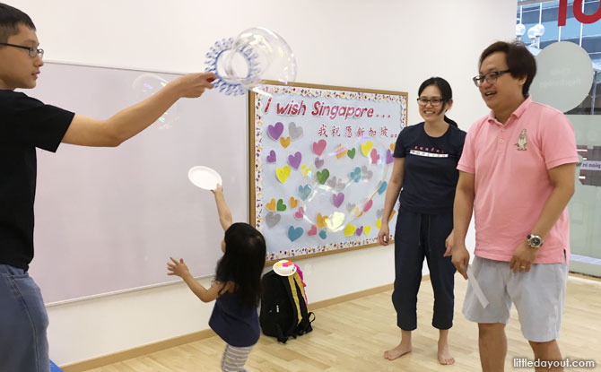 Bubble-loving kids went wild at the next station, where the task was to catch five bubbles without popping them, using their choice of materials ranging from paper plates to tissue paper and aluminium foil.