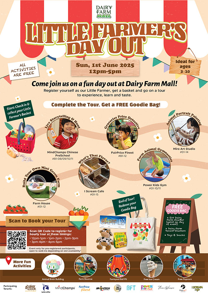 Calling all Little Farmers! Have a fun-filled time with kid-friendly, farm-themed activities at Little Farmer’s Day Out on Sunday, 1 June 2025, at Dairy Farm Mall.