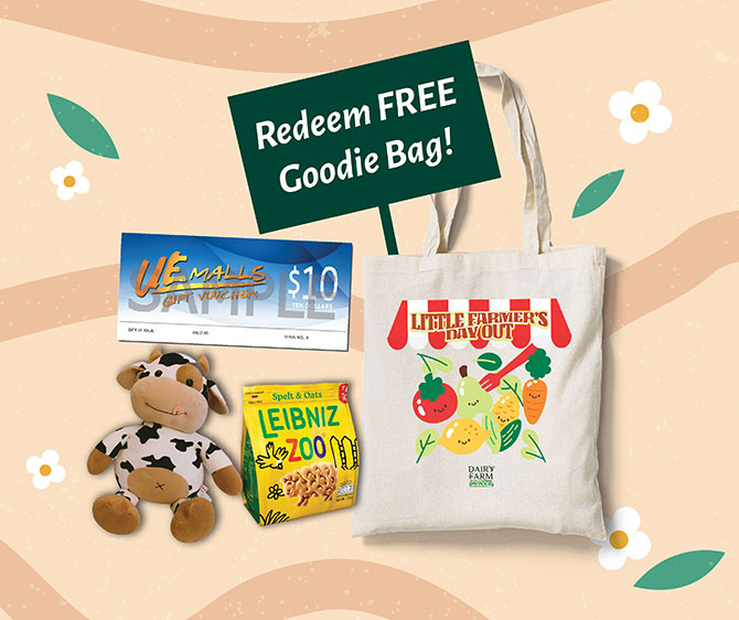 Inside the limited-edition Little Farmer’s tote bag, kids will receive an adorable cow plushie, yummy snacks and a $10 Dairy Farm voucher for use on the same day, plus exclusive tenant vouchers!