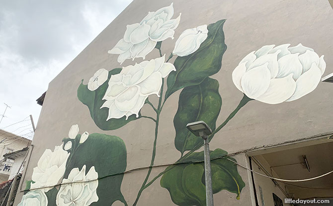 This piece of Little India art is dedicated to migrant workers in Singapore. The jasmine flowers painted by artist Nadia are symbolic of their growth and determination to provide for their families. It can be found at an alleyway at 27 Chander Road.