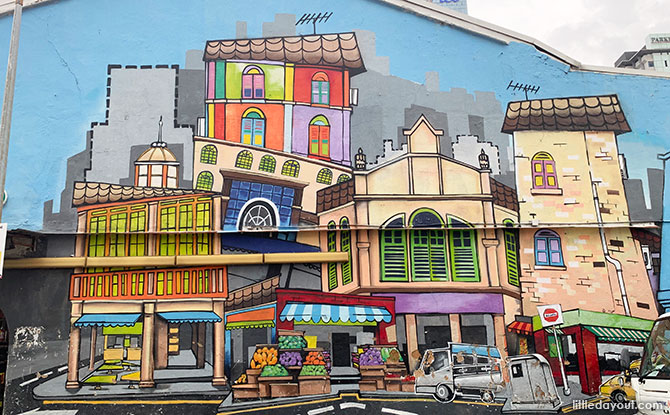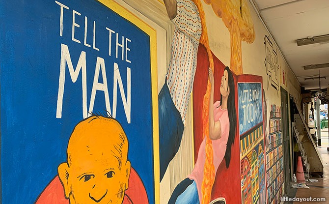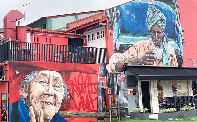 At the coffee shop found opposite from the Traditional Trades of Little India mural, there are scenes of India, including the Taj Mahal, painted along the walkway. You can admire the street art while having a drink there.