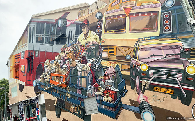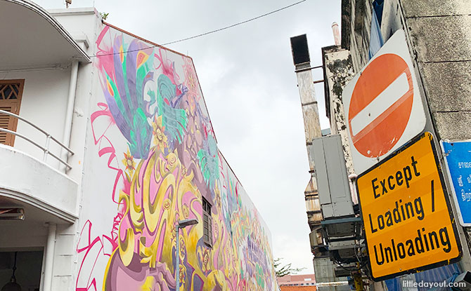 Created by Psyfool, Traditional Trades of Little India is a mural which highlights trades of the past. Look for the dhobi, the parrot astrologer, the milk seller and more. It is found along Belilios Lane.