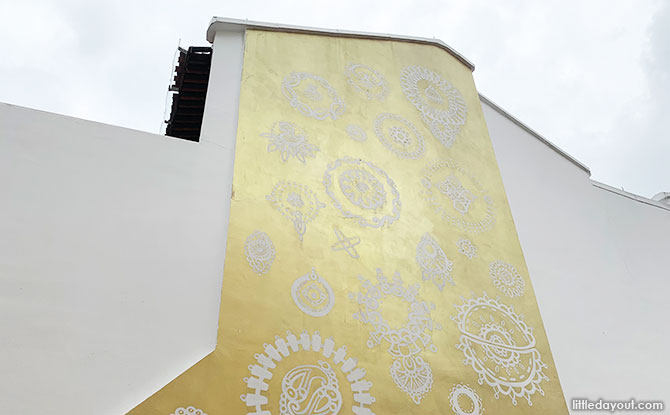 This towering mural by Priyageetha D/O Diayalan is a tribute to the goldsmith trade and jewellery making. Its circles represent how heirlooms are passed from one generation to the next.