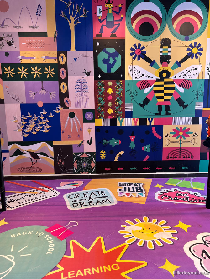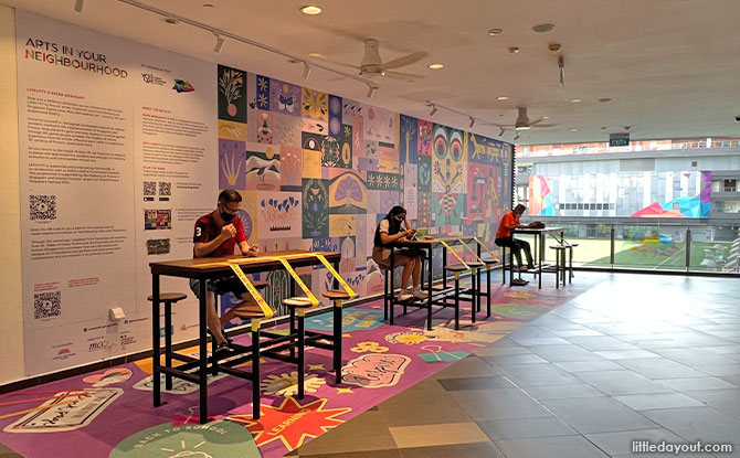 Located at Our Tampines Hub, Level 2 Study Area and External Wall facing Tampines Central Park, visitors can admire a mural by LIVELYYY by French artist Guillaumit and Extra Ordinary by Singapore-based artist Mary Lee Bernadette. This mural is part of the National Arts Council’s Arts In Your Neighbourhood November 2021.