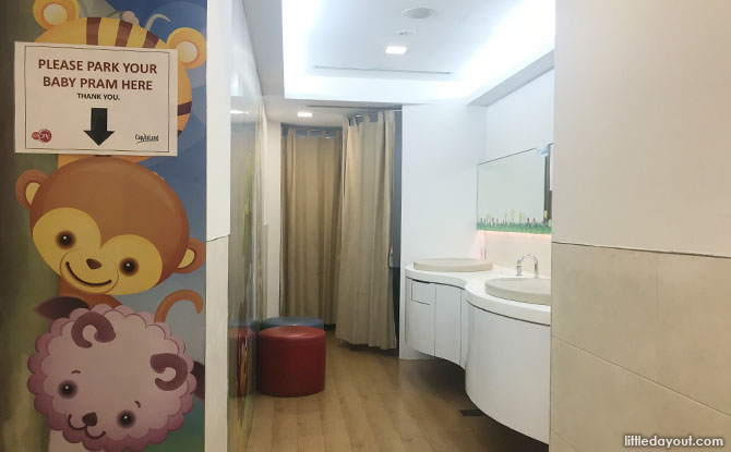 Clean, spacious and brightly-lit, the nursing room at Lot One Shoppers’ Mall is well-equipped with two padded diaper changing mats, a hot and cold water dispenser and two cushioned stools. The room also has a spot for parents to park their strollers neatly before using the facilities. In addition, there are two private breastfeeding rooms that are furnished with an armchair, table, cushioned stool and an electrical point per room- all the necessary facilities for nursing mothers to breastfeed or express conveniently. However, do note that the breastfeeding rooms are separated from the main nursing room by curtains that can be drawn only.