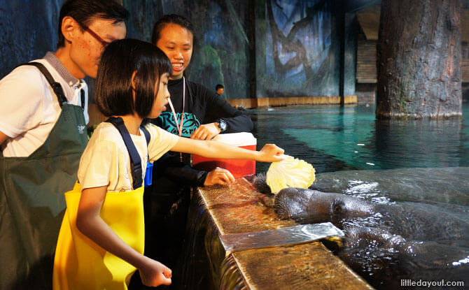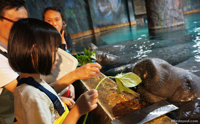 Each manatee is trained to recognise a different colour so that aquarists can communicate with them individually using coloured sticks. I was impressed with how obedient they were: They never fought for food. They ate their vegetables even though they knew their favourite biscuit was on the menu. It just felt so relaxing to be spending time with them – looking into their kind eyes, feeding them, and patting them on their heads.