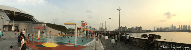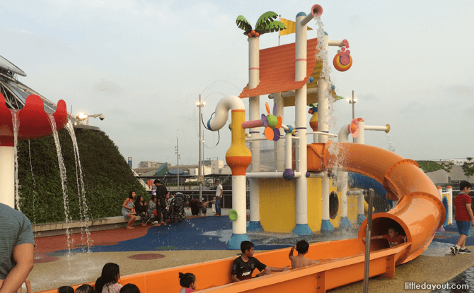 Hands down, the water playground with the best view has to be found above Kallang Wave Mall at Singapore Sports Hub. The Kallang Wave’s water playground, Splash n Surf, is not very big but its vista of the Kallang Basin and the city skyline makes up for its diminutive size.