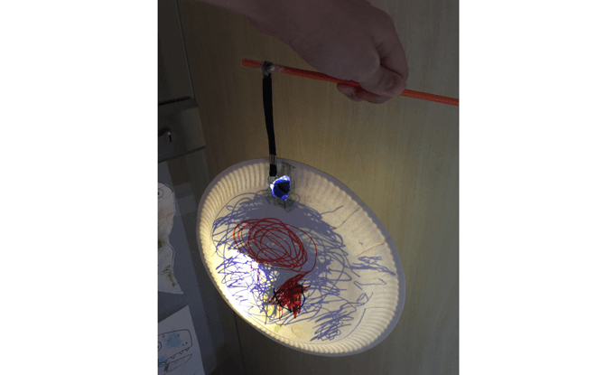 2. Affix the torch into the concave side of one plate. Cut a small hole on the plate to allow you to turn on and off the torch, depending on where the button is. If the torch has a strap, make sure the strap is left outside the plate to attach it the straw to form the handle for the lantern.