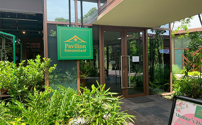 North and South Indian cuisine is served at the Pavilion Banana Leaf restaurant. We like the outdoor area where there are seats that look like swings.