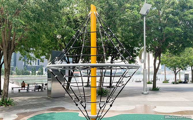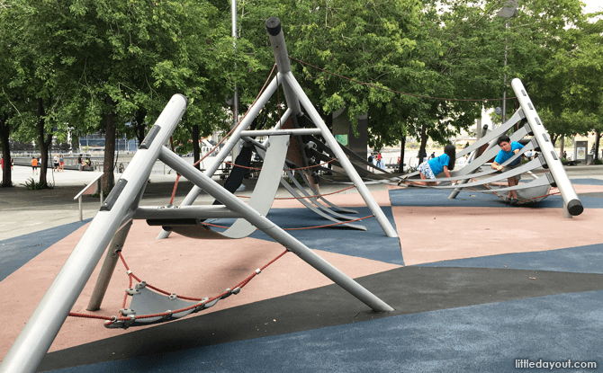 The Marina Bay playground made up of pyramidal-shaped structures fashioned out of metal tubes. These are interconnected by flexible sheets of plastic and guide ropes. Slung underneath two of the pyramidal structures are low hammocks.