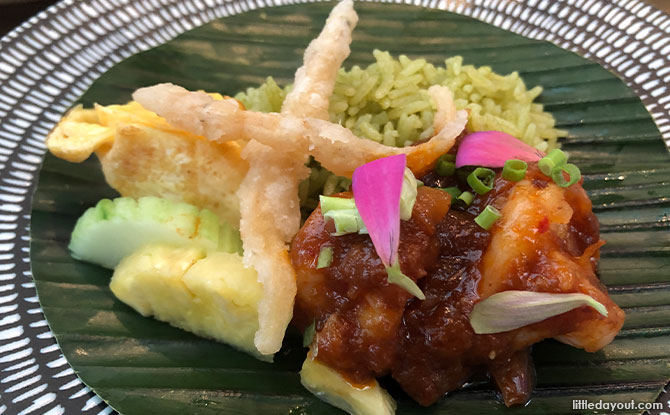 The recipe for this Nasi Lemak is rooted in Junior Sous Chef Adam Bin Razali’s Malay heritage as he follows the traditional way of making rice with a twist. Unlike most nasi lemak rice, this version is made by infusing coconut milk and freshly squeezed pandan juice, giving it a beautiful pale green hue and fragrant taste.