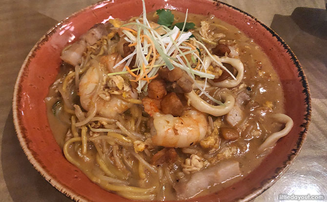 Those who are fans of the traditional savoury dish of Hokkien Mee are sure to enjoy this umami-laden noodle dish. The stock includes freshly cooked prawn heads, old hen, pork bone, lean meat and a house-made red chilli blend. Stir-fried yellow noodles and thick vermicelli are served with fresh prawns, squid, pork belly, eggs, beansprouts and chives.