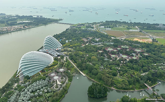 Look southward, Gardens by the Bay lies at the base of the Marina Bay Sands towers.