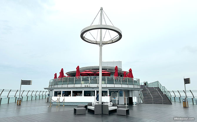 A “flagpole” does make it appear that you are on the deck of a ship, sailing at the top of the world. There are some seats under the flagpole. Other seats can be found at the side of the observation deck facing Gardens by the Bay.