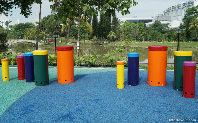 However, the musical playground is so-called because of the row of musical instruments lined up facing the Marsiling Park lake. This ensemble includes tubular bells, congas, a xylophone, bell lyre and hand drums.