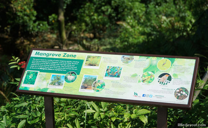 Along this stretch of the park, information panels explain about the different zone found within a mangrove forest ecosystem. These zones include a brackish water environment to a transition zone to the freshwater area.