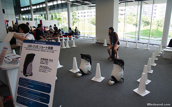 These include trying out the UNI-CUB, a personal mobility device by Honda, and watching a demonstration of ASIMO, a humanoid robot.