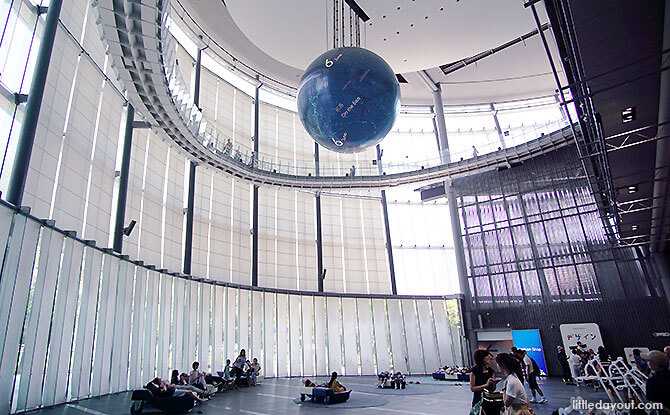 The third and fifth floor exhibition halls are connected by an oval bridge which allows for a 360-degree view of the massive sphere.