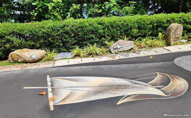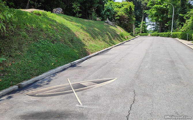 Yip Yew Chong’s realistic murals have a fascinating look especially because of the various surfaces he chooses to work on. As we entered Fort Siloso Road, a modest sampan painted on the road served as a perfect spot for picture-taking and also heralded the view of a kampong. And what else would you have spotted? The same lion that Sang Nila Utama could have seen as this was likely the area he first landed on when he sailed from Palembang.