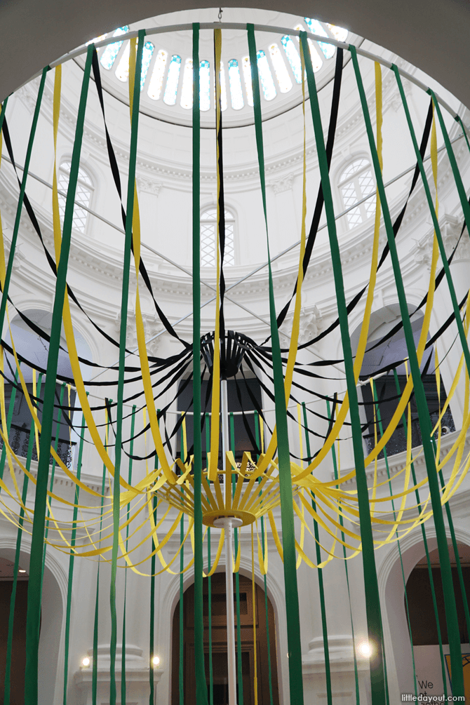 Spot the swinging chandeliers at level titled Wings of a Rich Manoeuvre by Suzann Victor. The eight mesmerising wing-like chandeliers swing in choreographed oscillations based on harmonic motion. It marks the passing of time to the past then to the present.