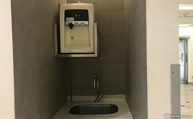 The NEX nursing room is small and minimally furnished with a sink, padded diaper changing mat and a hot and cold water dispenser. Due to the lack of electrical points and seats, the NEX Nursing Room is more suitable for emergency diaper changes than for nursing mothers to breastfeed or express. Privacy may also be compromised as the door is slightly translucent.