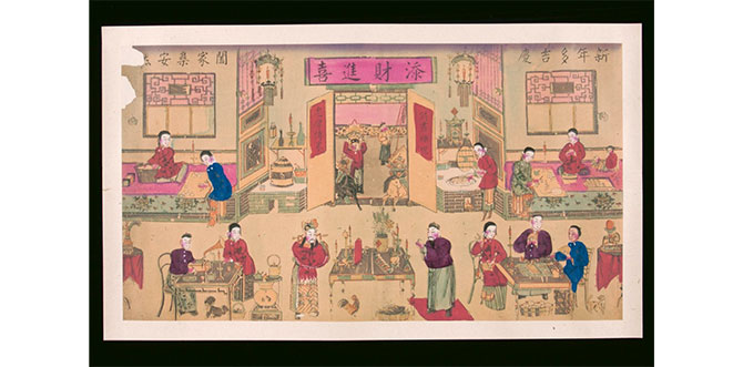 Among the highlights is a facsimile of a print which shows a multi-generational family celebrating the Lunar New Year. It shows activities such as cooking dumpling and a card game in progress. There is also a couple listening to a gramophone in the corner.