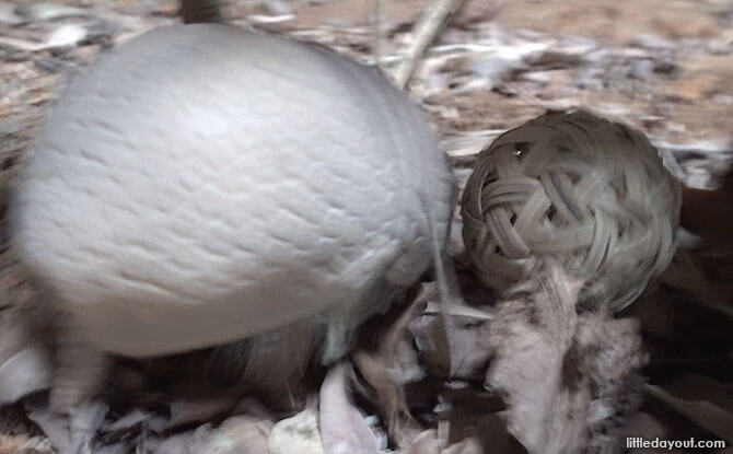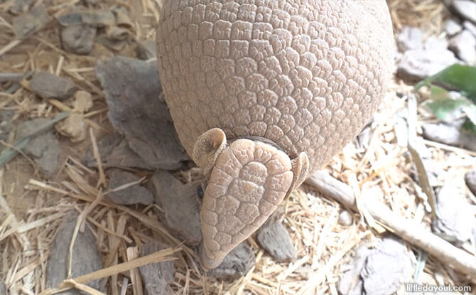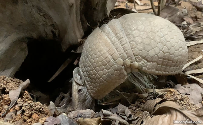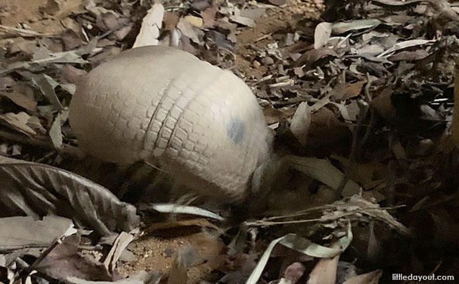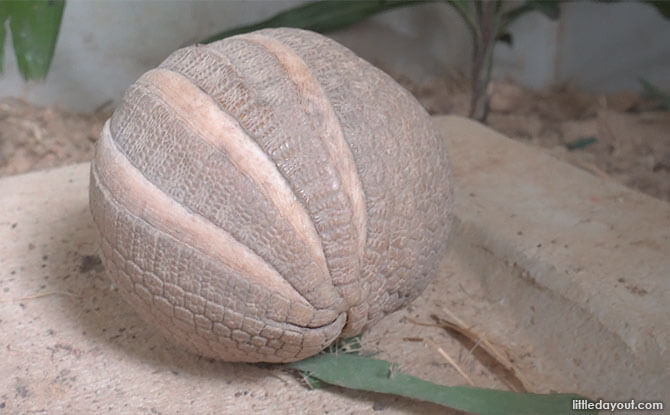 However, the species at Night Safari, the southern three-banded armadillo, is one of two species that is able to curl itself up into a complete ball for protection. It does so by folding its body in half and tucking its heads and legs into its shell.
