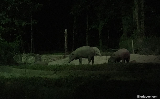 The Night Safari walking trail leads on to the East Lodge tram station and then back towards the attraction’s main entrance. Along the way, we encountered the lumbering Sloth Bear (not related in any way to sloths), Babirusa, Spotted Hyenas and Malayan Tiger. Try as we might, we were unable to spot the Serval, an animal we were hoping to see, in its enclosure.