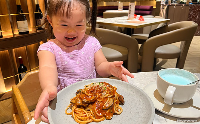 Little Pea “knowingly” picked Mushroom Marinara Pasta from the Kid’s menu and gleed with so much delight when she was served. Little Pea slurped up the al dente ‘marina’ style pasta which had a hint of natural sweetness to its tomato flavour, and enjoyed chewing the soft shiitake mushrooms. Here, kids eat free with every adult’s order of mains or pasta. Families Pastas run up to $25+ and feature signature flavours like Chill Crab, Truffle cream and all-time kids’ favourites like Carbonara, Mac and cheese.