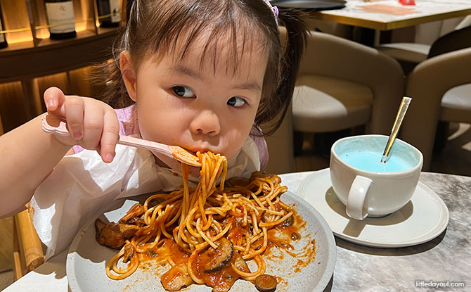 Little Pea “knowingly” picked Mushroom Marinara Pasta from the Kid’s menu and gleed with so much delight when she was served. Little Pea slurped up the al dente ‘marina’ style pasta which had a hint of natural sweetness to its tomato flavour, and enjoyed chewing the soft shiitake mushrooms. Here, kids eat free with every adult’s order of mains or pasta. Families Pastas run up to $25+ and feature signature flavours like Chill Crab, Truffle cream and all-time kids’ favourites like Carbonara, Mac and cheese.