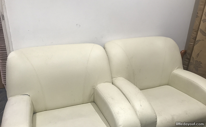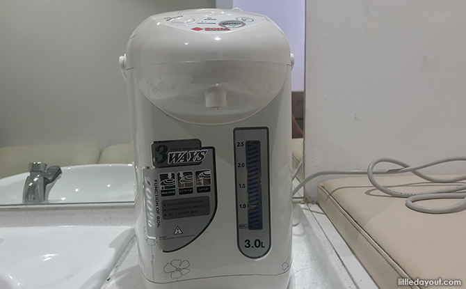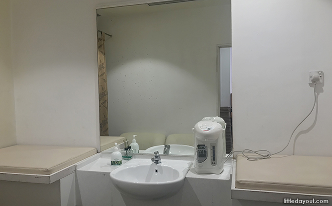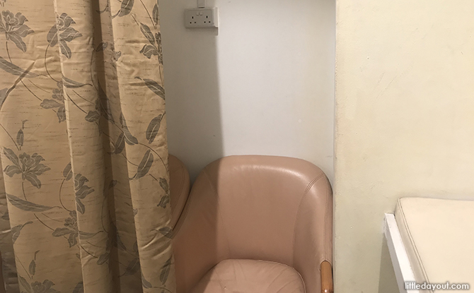 The OG Orchard Point Nursing Room is brightly lit and decently furnished with two padded diaper changing mats, a sink, a hot water dispenser and two large armchairs.