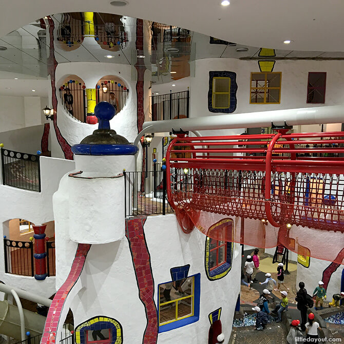 An indoor “Kids Town” designed by Austrian artist and architect Friedensreich Hundertwasser forms the main structure of the fourth and fifth floors. There are slides, plenty of hands-on, interactive exhibits that explain various aspects of nature, physics, technology and the world in general.