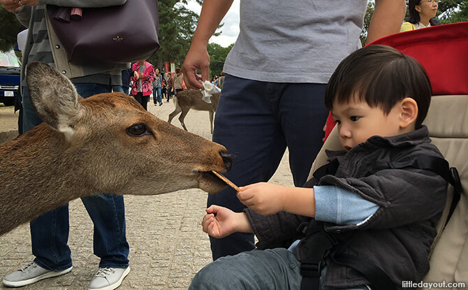 What would be fascinating for kids is to see the free-roaming deer. The deer have roamed freely here since the 1800s. You can buy Shika Senbei or deer biscuits and feed them to the deer. Be careful though, because some deer can get very excited seeing the biscuits, and be sure to avoid stepping on deer ‘poo poo’! My Little Human’s favourite animals are antelope and deer so seeing them up close made his day.