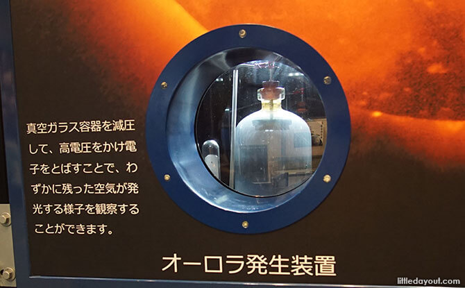 Among the different exhibits is an Aurora Simulator. This make use of a vacuum chamber to represent of the high-altitude atmosphere and allows visitors to view a simulation of what happens when the solar wind hits the atmosphere to create auroral light.