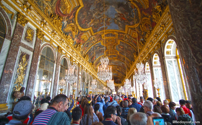 A highlight of the tour through Versailles is the Hall of Mirrors which bedazzles with a display of candelabra, mirrors and light.