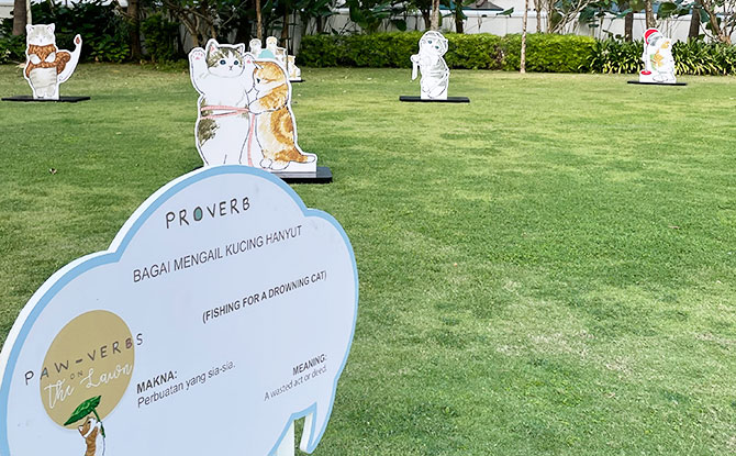 30 cat illustrations have appeared on the lawn of the Malay Heritage Centre. Part of Paw-verbs on the Lawn, together with standees of Malay proverbs, they highlight how the cat is portrayed in Malay proverbs and literary culture.