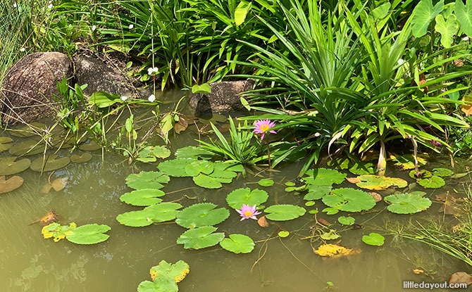 Lotus plants adorn a corner of the pond while dragonflies zip across the water’s edge.