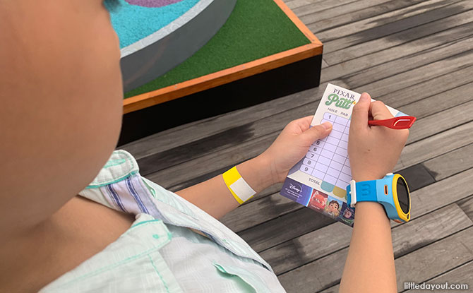 There are a total of 18 holes at the open-air Pixar mini golf course.
