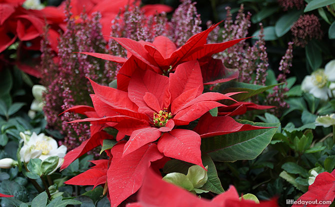 Also taking centre stage at the floral display are different varieties of poinsettias. The traditional red poinsettias are closely associated with Christmastide. The brightly colour part of the plant is often mistakenly identified as the plant’s flower but they are actually the leaves of the poinsettia.