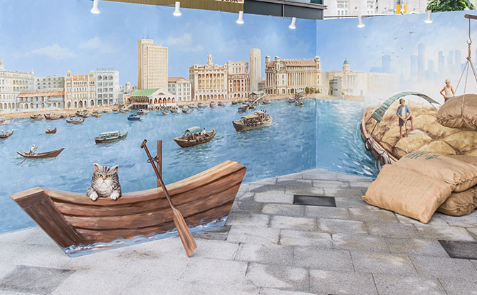 Singapore’s Waterfront is a tribute to the bustling waterfront, now the Marina Bay, and its boatsmen and ‘coolies’ whose tireless efforts shaped the city’s early trade. Look out for Yip’s signature cat in this scene.