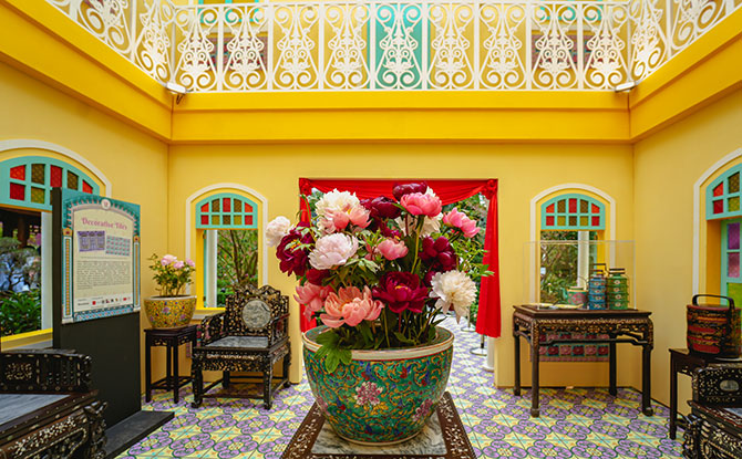Amongst the flowers are artefacts of Chinese and Peranakan culture on loan from the Peranakan Museum, The Intan and The Society for Chinese Ceramics Studies.