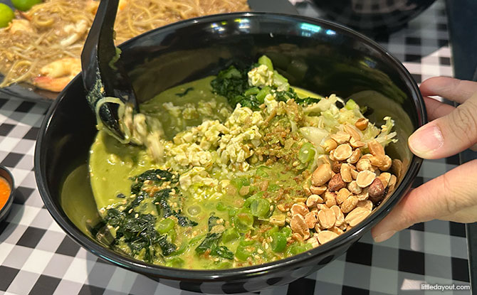 This dish features a variety of fresh vegetables like long beans, sayur manis, chye sim, cabbage as well as preserved radish, dried shrimps, firm tofu and peanuts. There is a set available that comes with three pieces of yong tau fu to complement the dish of greens.