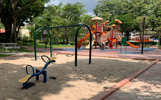 The Punggol Park playground is located in the middle of the park. The bright orange-and-yellow playground looks like a mess of passages and slides, something which kids would find fun.